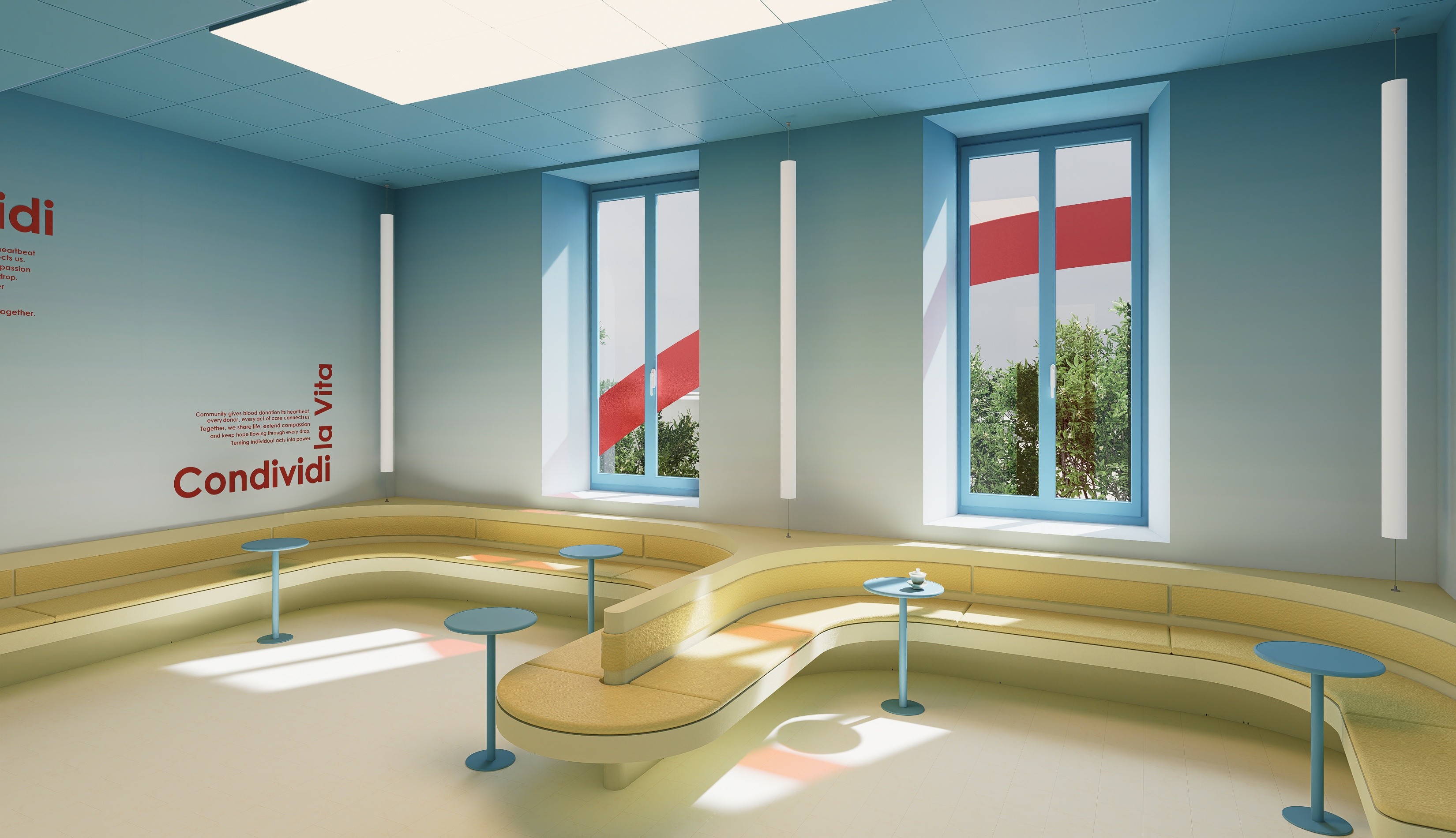 Its steady, one-directional flow guides the sequence of spaces, much like the donorโs path and the transparent tubes that carry blood to the bag. The design translates this flow and diversity into spatial gestures that express our four core principles, creating an environment that is coherent and quietly provocative.
