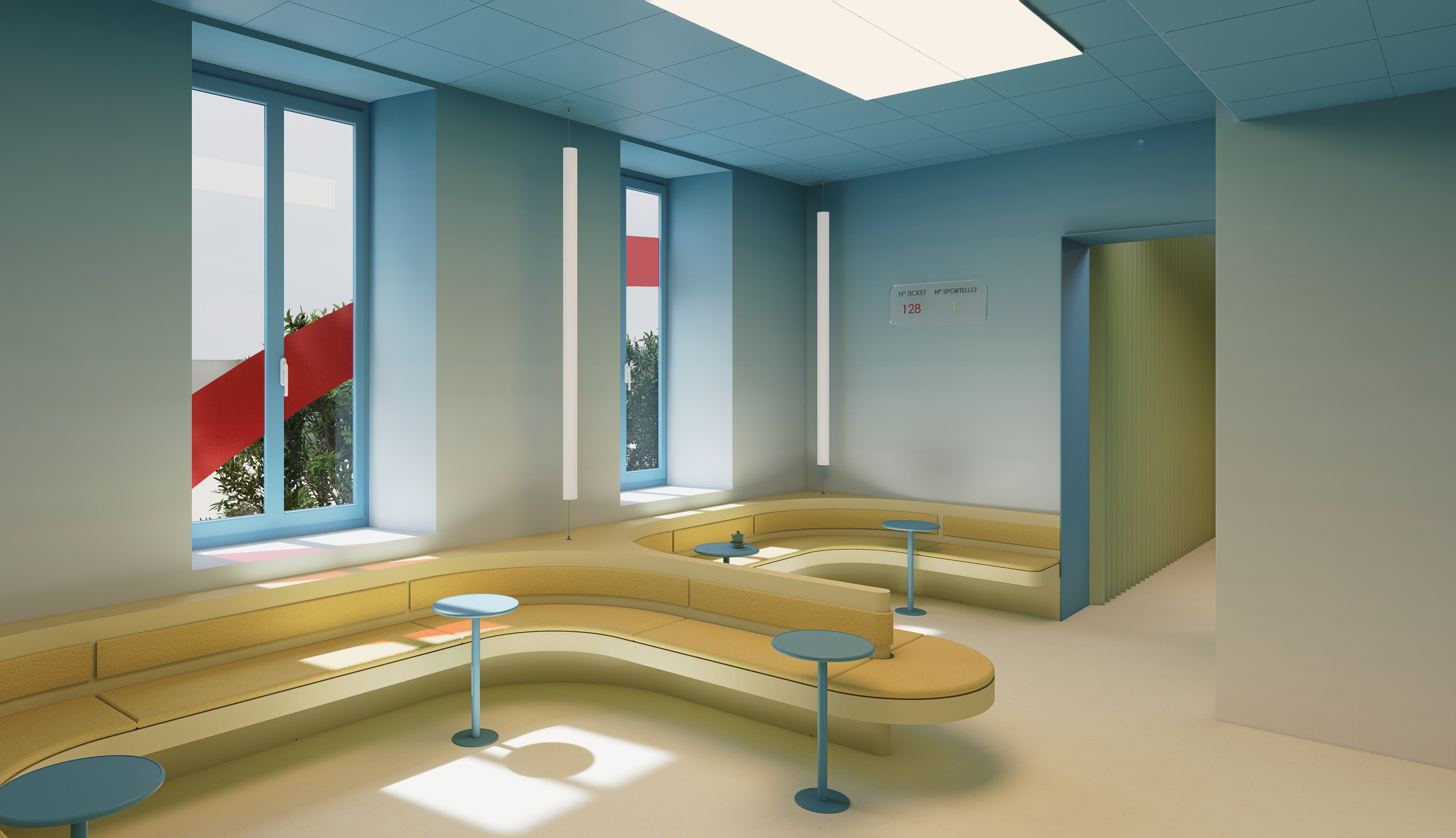 This room was designed to create a calm atmosphere before donors enter the donation area. Translucent sheer fabric panels suspended from the ceiling soften the space and reduce visual noise, with a sage-green gradient wallpaper behind them to reinforce a gentle, relaxed tone. Banquette seating along the perimeter maximizes usable space and keeps circulation clear.