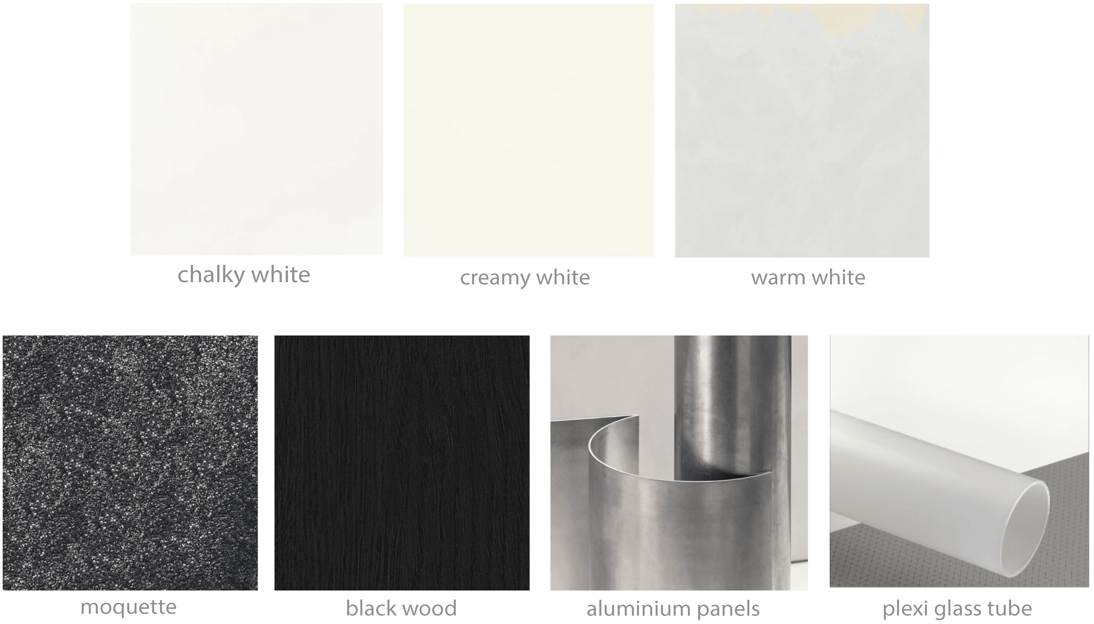 The backdrop features three shades of lime plaster, with a darker tone marking the central piazza. Soft moquette flooring adds quiet luxury and black wood furniture brings warmth and texture to balance the cool space.