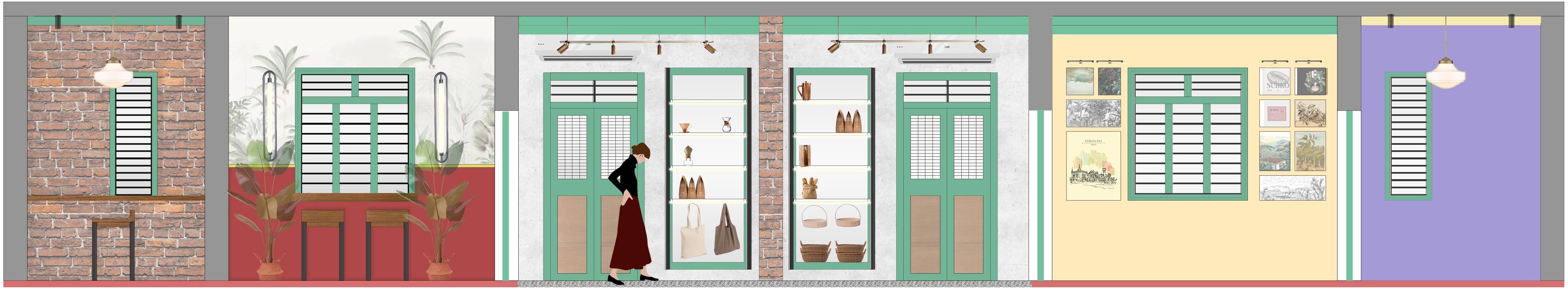 Overhangs and wall niches adapted into functional pockets for storage and retail display.