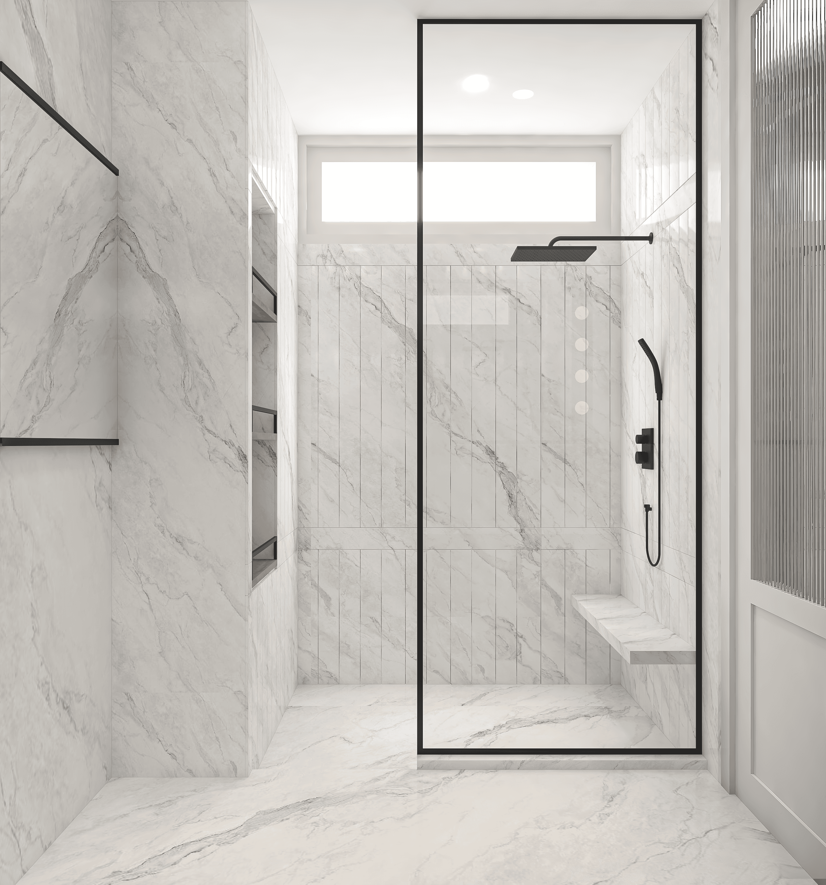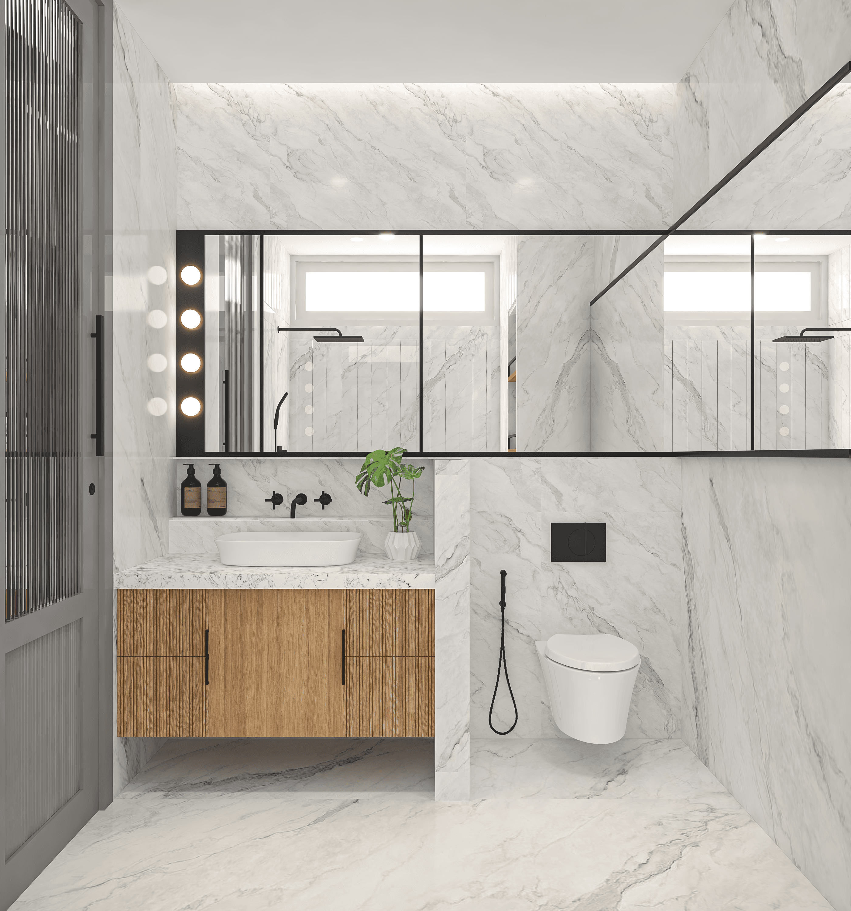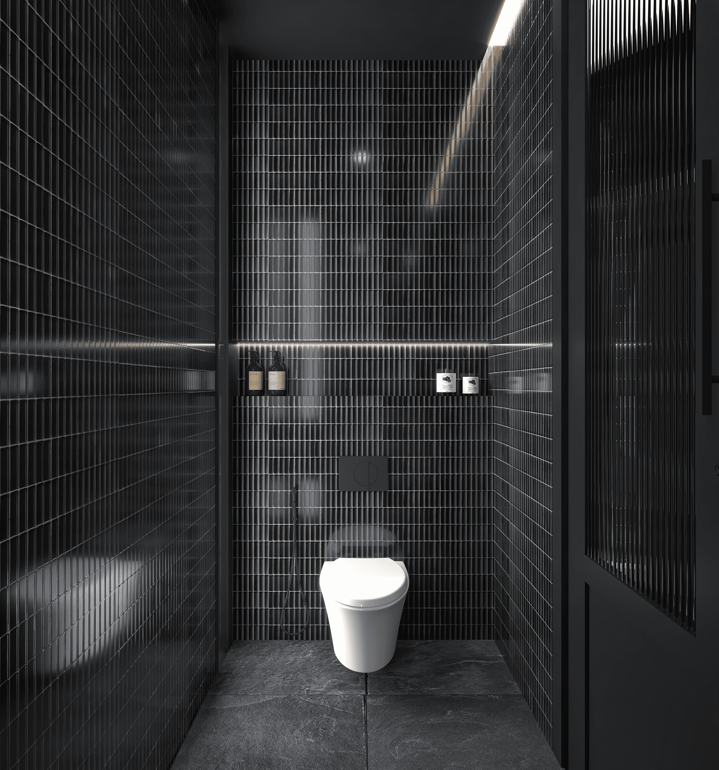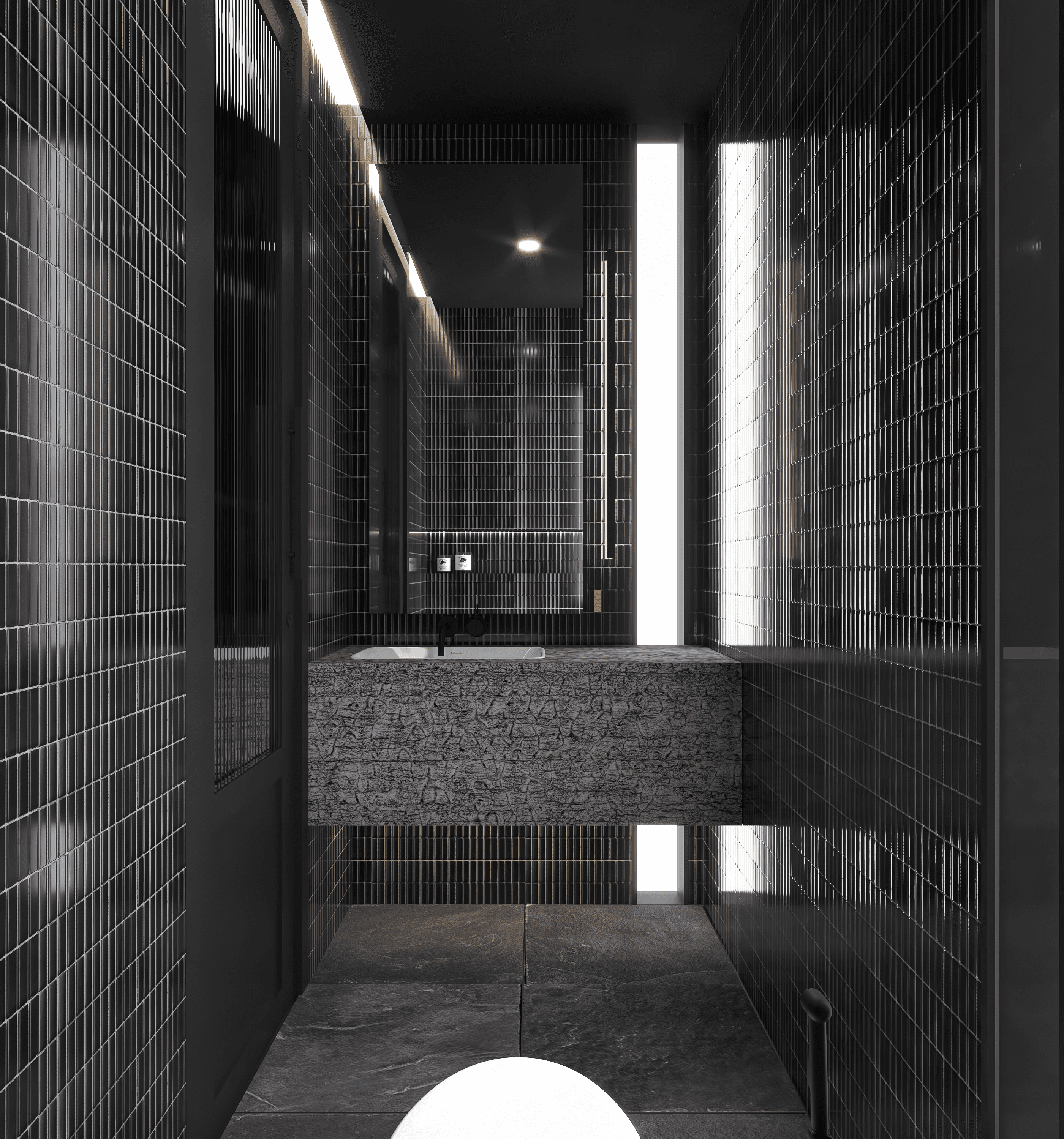 This washroom for the Terrace party area uses glossy black vertical tiles to create a sleek, elongated effect to enhance light reflection in the compact space. The stone vanity adds a contrasting natural texture. A linear strip window and skylight highlights the geometry of the room and ensures even illumination in an ambient way. The overall material selection focuses on durability, easy maintenance, and a refined, contemporary atmosphere.