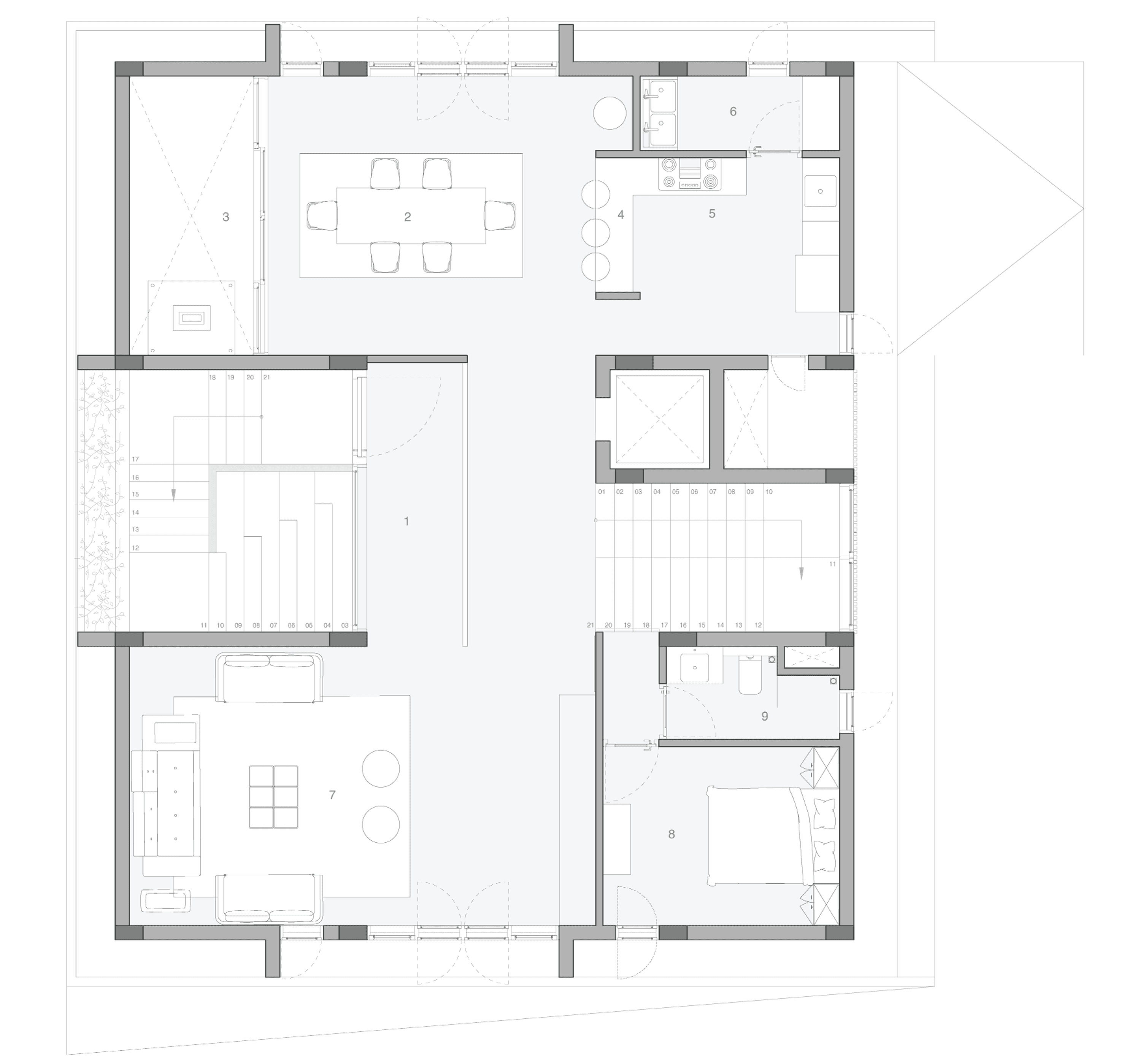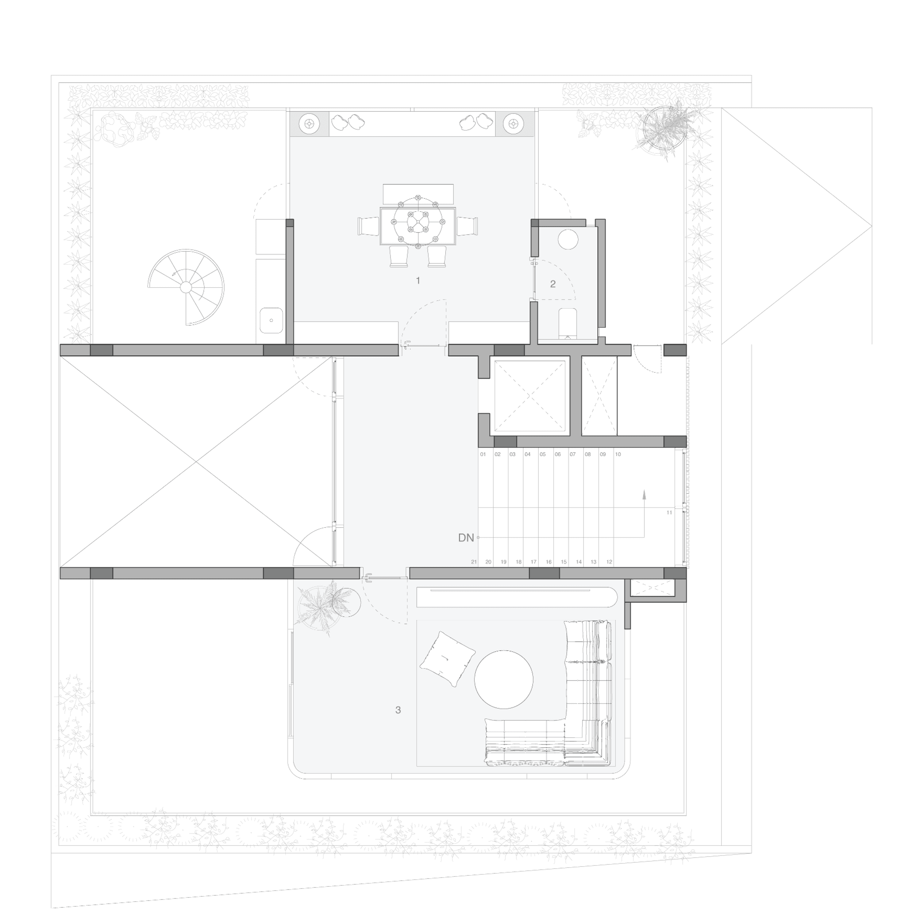 Spanning 12,000 sq. ft. across four floors, this residence for a family of five includes common areas, five bedrooms, and a terrace with a home theatre and glass house. The brief called for a contemporary design using solid natural materials.