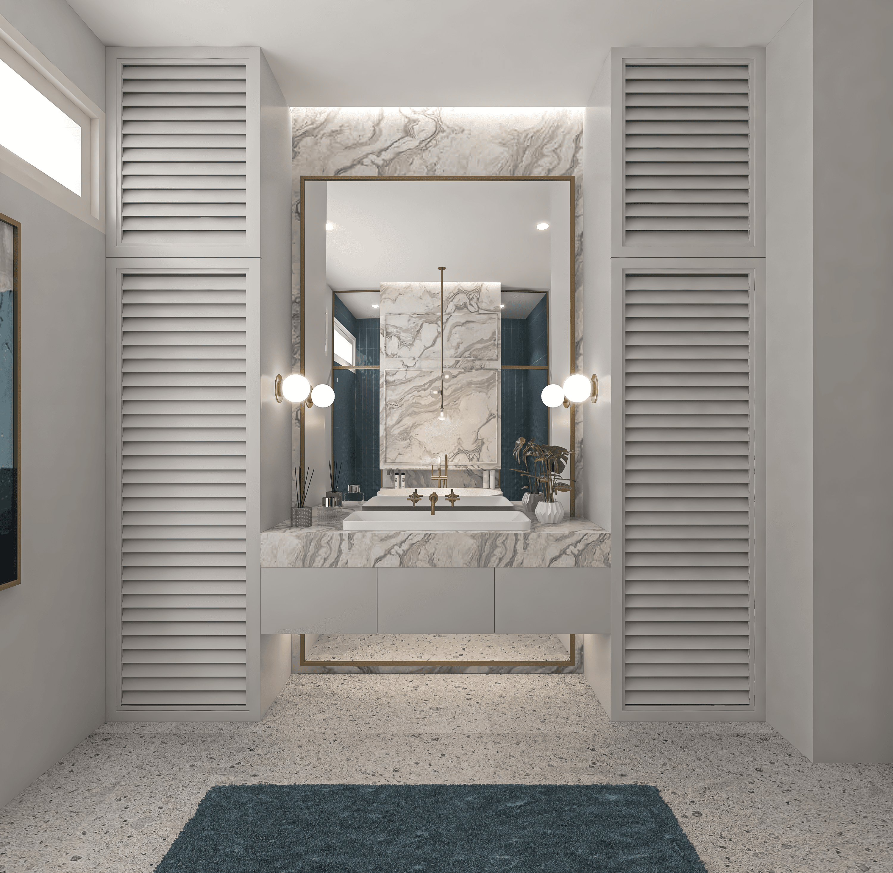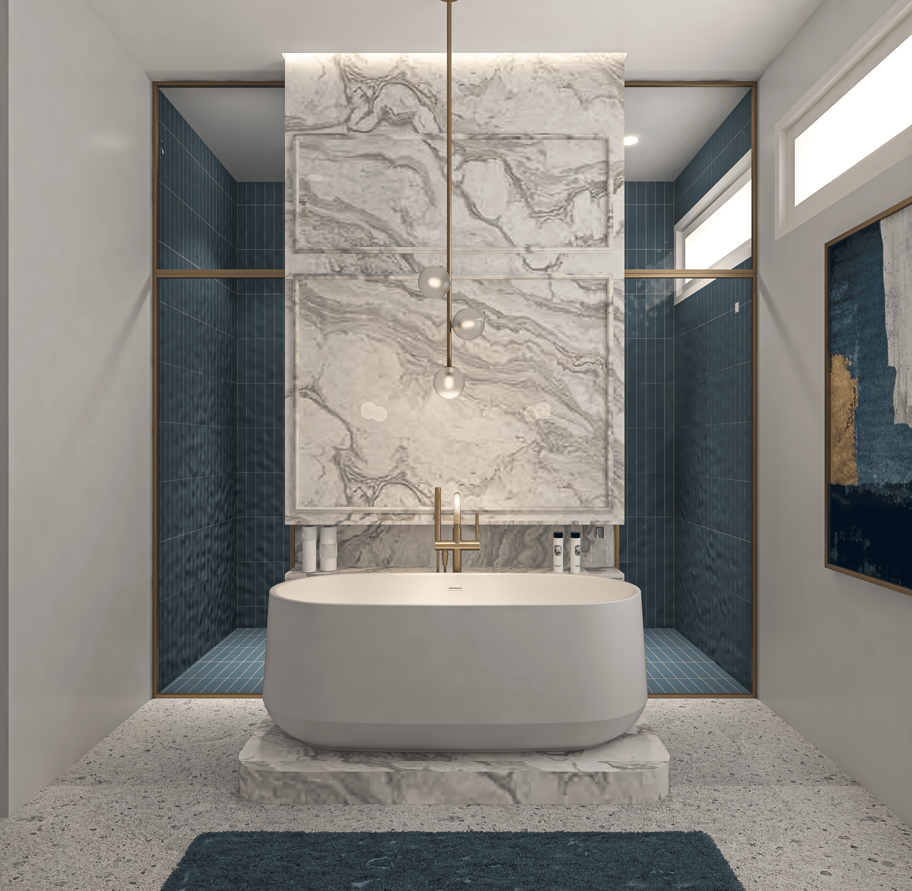 The vibe for the sons washroom was to elevate the layout which consists of a shower area and bathtub using shades of blue to add a sharp contrast with the marble. We picked brushed gold sanitary fixtures to add texture.