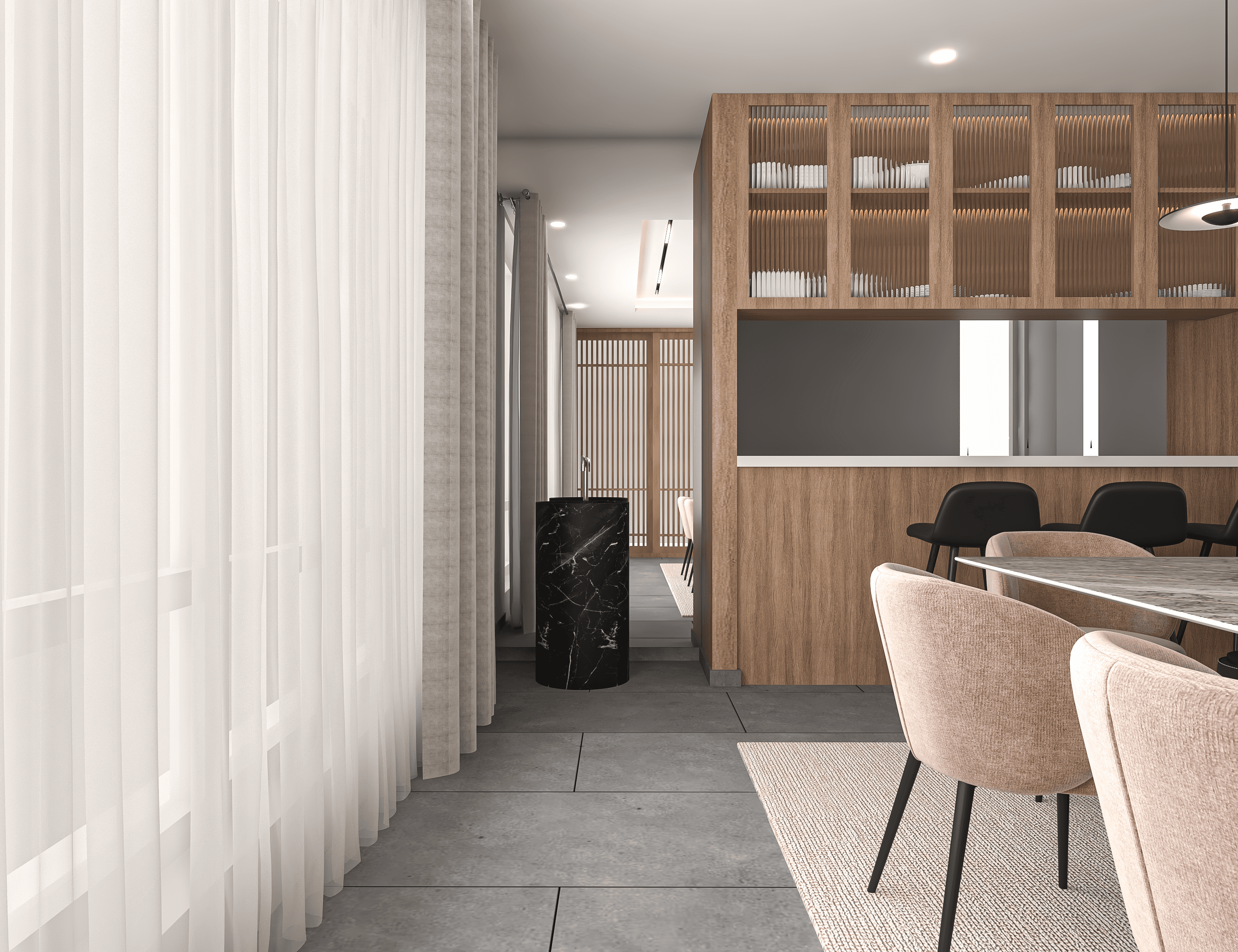 The dining area features a 6-seater table with dusty coral plush chairs, sleek black breakfast chairs which add a dark contrast and a crockery unit. Kota granite flooring was chosen to provide a neutral and easy to clean base.